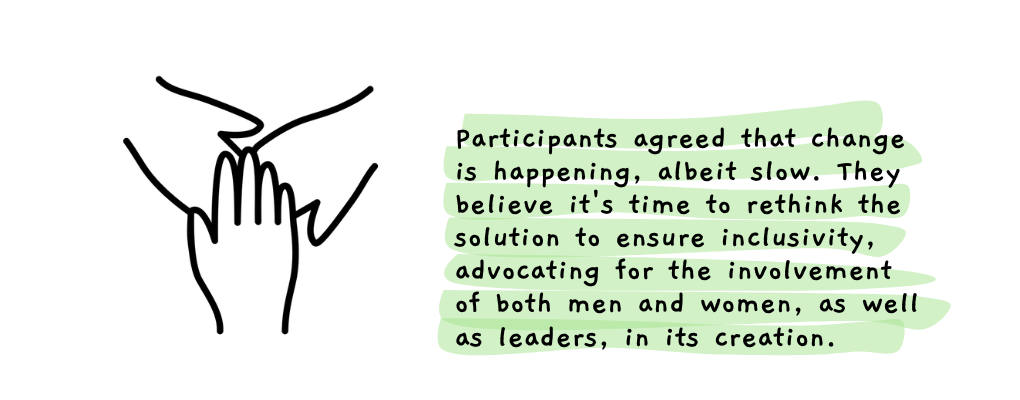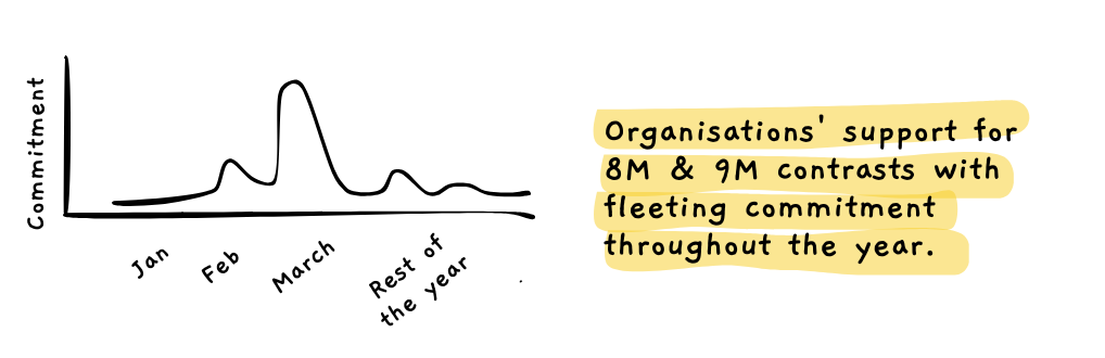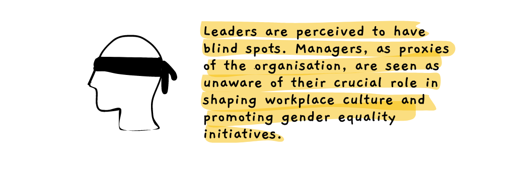 However, leaders are the ones who are being observed most closely, as they are perceived as proxies of their organisations. Participants described feeling somewhat confused by their managers. On one hand, they expressed their commitment to 8M & 9M, but on the other hand, their day-to-day behaviour, their unawareness of gender biases, and their lack of support for gender equality initiatives throughout the year were described as blind spots.